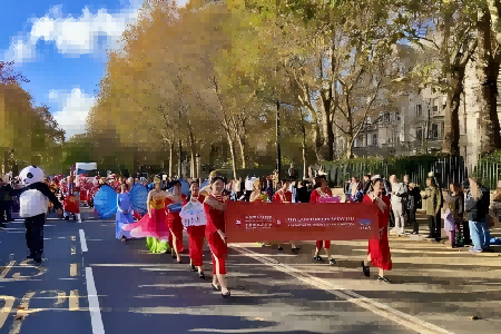 英国浙江会的31号方队阵容夺目,创意非凡。由气势恢宏的主题花车“西施号”与红色主题巴士组成的巡游单元,汇聚了百位热情洋溢的参与者。他们身着典雅曼妙的旗袍、绚丽多彩的中国各民族传统服饰,以及灵感来源于贝壳、荷花、熊猫等自然与文化符号的精美定制服装,在长达数公里的巡游路线上载歌载舞,以最具感染力的表演共庆盛典。沿途观众掌声雷动,喝彩声此起彼伏,无数手机和相机记录下这难忘的时刻,现场气氛热烈非凡。
