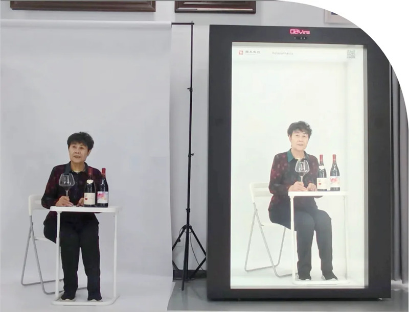 △新疆乡都酒业的创始人李奶奶通过“OBVerse奥比全息舱”复刻的数字人,讲述产品故事。