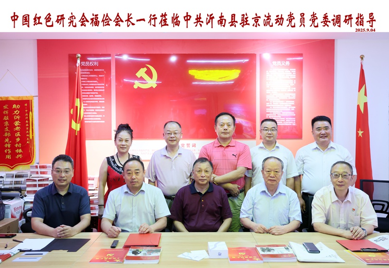 【中国经济报道(中经总网·中经在线)/世界品牌研究院全媒体矩阵 郭幸福 北京报道】9月4日下午,中国红色文化研究会副会长张福俭、胡澄、胡呈军、中国文联民间文艺中心主任刘加民、光明磊落展览馆馆长张宝权等一行六人到沂南县驻京流动党员党委开展调研座谈活动。此次活动以“弘扬沂蒙精神,传承红色文化”为主题,旨在深入探讨红色文化传承与党建工作的融合发展。