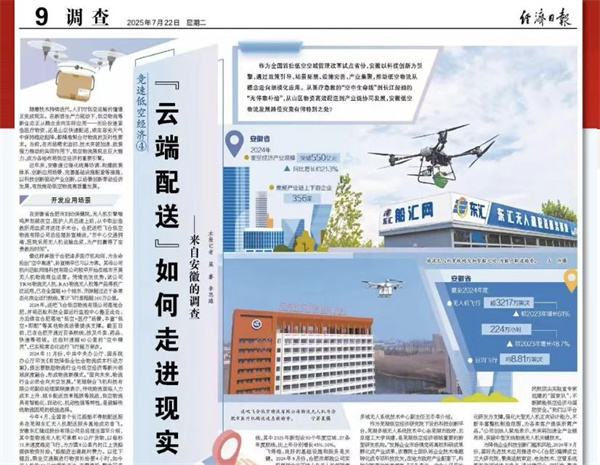 当前,安徽密集出台政策,通过印发《安徽省航空物流发展规划(2023—2035年)》等系列文件,构建覆盖资金、基建、空域、产业、人才全链条的支持体系,重点强化对通用航空和低空物流的精准扶持。“今年1月份,安徽提出探索无人机融入县乡村三级寄递网络,发展无人机配送、城际运输等新兴物流方式,支持开通无人机物流航线。”安徽省通航服务中心副主任张军介绍,安徽积极推广商圈即时配送、山区物资运输等成熟应用场景,并通过调研创新探索跨江吊运、多式联运等新型应用场景,为低空物流发展注入动力。