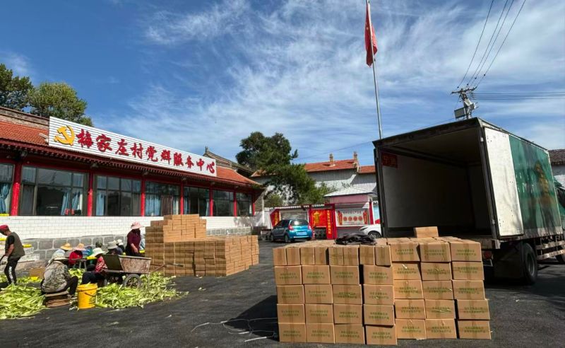 村委大院里,村支书田常青和乡政府领导组织协调,驻村工作队、选调生、在村大学生现场支援,梅家庄村30余位留守妇女、低收入村民共同设置临时打包车间,让村民在家门口就能挣上“劳务钱”。从白昼到深夜,灯火通明的村委见证了这场“抢鲜”接力,仅一天时间,1200箱玉米全部码垛封装,其中600箱已连夜搭上邮政运输车,发往千家。