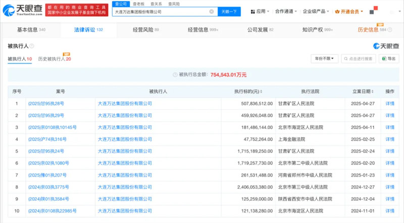此前的3月18日,北京万达文化产业集团新增1条股权冻结信息,被执行人为大连万达集团,冻结股权数额为80亿元,冻结期限为2025年3月18日至2028年3月17日,执行法院为河南省郑州市中级人民法院。