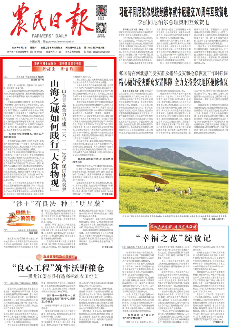 这幅海陆共舞的丰饶图景,源自青岛践行“大食物观”、扛牢粮食安全的使命担当。山东省委常委、青岛市委书记曾赞荣表示,青岛市牢记总书记“要树立大食物观”的指示精神,聚焦“稳住粮袋子,丰富菜篮子”,实施“36111”稳产保供工程(年产300万吨粮食、600万吨蔬菜、100万吨肉蛋奶、100万吨水产品、100万吨果品以上),持续打出建设绿色增粮先行区、推进高标准农田建设、打造新质牧场、发展现代设施农业等一套“组合拳”,确保粮食、蔬菜、肉蛋奶、水产品、果品等重要农产品稳定供给。