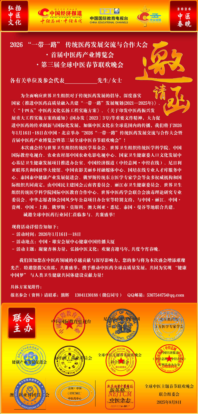 为全面响应世界卫生组织对于传统医药发展的倡导,深度落实国家《推进中医药高质量融入共建“一带一路”发展规划(2021-2025年)》、《“十四五”中医药文化弘扬工程实施方案》、《关于印发中医药振兴发展重大工程实施方案的通知》(国办发(2023〕3号)等重要文件精神,大力促进中医药的传承创新与国际化发展,加强中医文化在全球范围内的传播,我们将于2026年1月16日-18日在中国·北京举办“2026“一带一路”传统医药发展交流与合作大会暨首届中医药产业博览会暨第三届全球中医春节联欢晚会”!