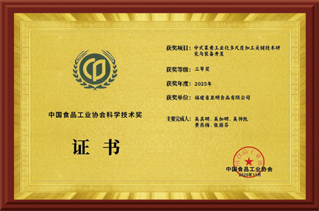 近日,福建省亚明食品有限公司凭借“中式菜肴工业化多尺度加工关键技术研究与装备开发”项目,成功斩获中国食品工业协会科技进步奖三等奖!这一奖项含金量十足——由1981年经国务院批准成立的全国食品工业权威组织设立,经科技部、科学技术奖励工作办公室正式批准,是食品工业科技领域的代表性荣誉,被誉为行业“科技勋章” 。其评审遵循“公平公开公正”原则,实行限额择优机制,需通过生产实践检验、多轮专家审核与社会公示,对项目的创新性、技术含量及产业价值有着严苛要求。