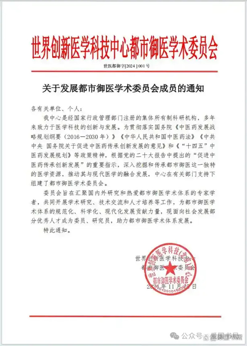 世界创新医学科技中心:关于发展都市御医学术委员会成员的通知