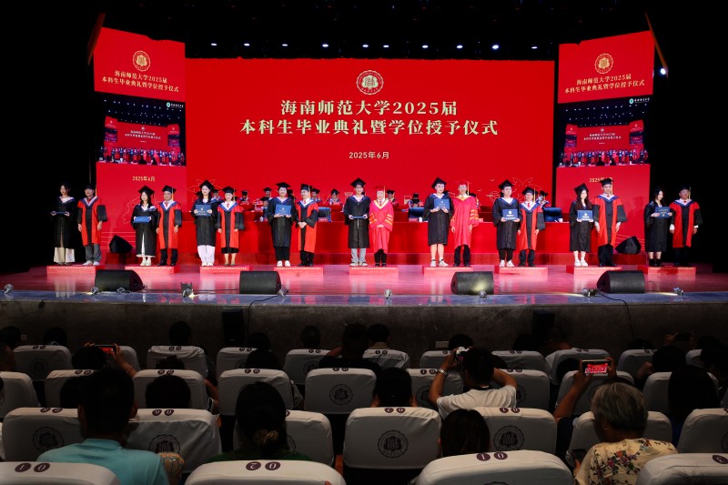“椰风阵阵吹天涯,我们相聚在师大”,毕业典礼在全场合唱《海南师范大学校歌》声中落幕。