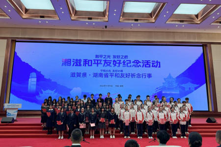 当《明天会更好》『上を向いて歩こう』旋律响起,中日两国青少年并肩站立,相互使用对方的语言唱出共同的友好心声,现场掌声雷动。随后的和平书法展示中,笔墨晕染间流淌着对和平的共同向往;而最特别的环节,莫过于全体人员共同栽下的42棵桂花树——枝叶相触的沙沙声里,藏着湘滋两省县“根深叶茂、长久不衰”的深情约定。