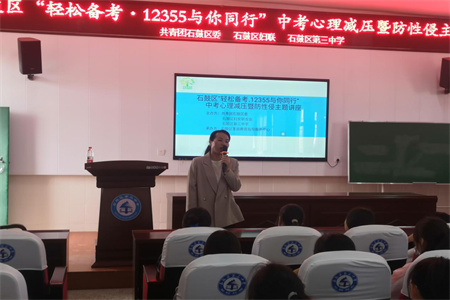 中经网·中经在线湖南衡阳讯(张星兴 通讯员 李凌云 全国民 蒋敏)中考在即,为帮助缓解九年级学生面临中考的心理压力,增强同学们冲刺中考的信心,帮助同学们以良好的心态面对中考,5月9日上午石鼓区第三中学邀请团区委、区妇联一起共同组织九年级学生开展“轻松备考·12355与你同行”中考心理减压暨防性侵主题讲座。
