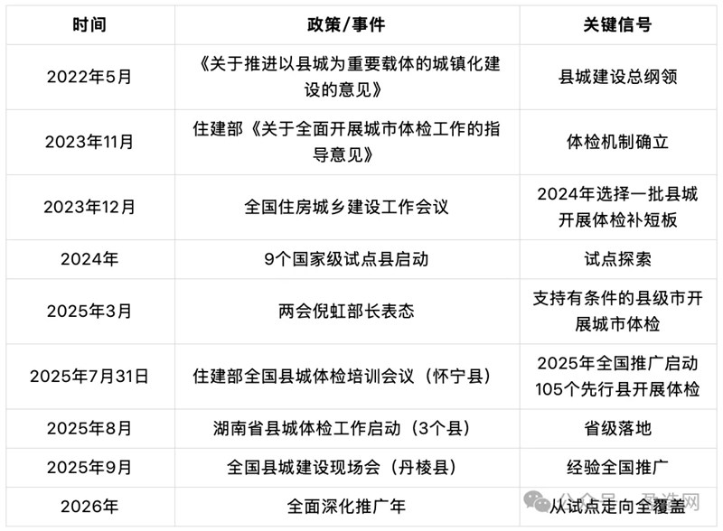 • 在国家持续推进以县城为重要载体的新型城镇化战略背景下,城市体检工作正加速从试点探索迈向全国体系化实施。随着住建部工作部署不断深化,县城体检与县级市体检进入规模化推广阶段,一个覆盖更广、标准更高、节奏更快的城市体检新时代正在形成。