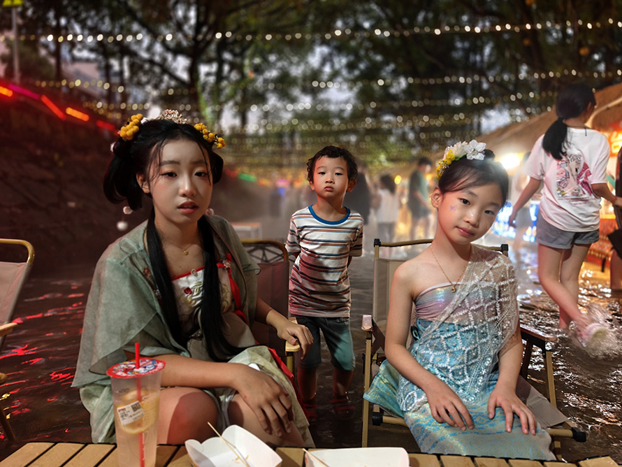 波光闪动的溪流中,三个来自德国的小朋友正踩着水浪追逐。刚到白溪就被溪水里的清凉勾住了脚步。“戏水、美食、游乐,太爽了!” 妹妹首先下水,三个小家伙立刻蹲下身,手指在水中划出浅浅涟漪。玩累了便挤在帆布小凳上,任凭雨水顺着发梢滴进脖颈,又举着刚买的台湾蚝蛋烧大快朵颐,橙黄的蛋皮裹着海蛎香,混着西瓜汁的清甜咽进肚里。