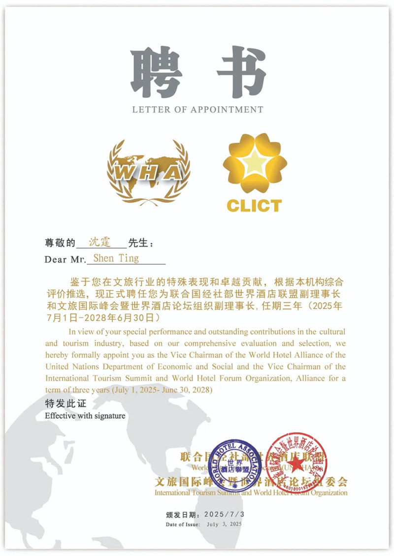 据世界酒店联盟消息:经研究决定,现正式聘请沈霆、杨晏担任联合国经社部世界酒店联盟副理事长和文旅国际峰会暨世界酒店论坛组织副理事长,杨晏兼任驻中国秘书长。任期三年,自2025年7月1日起生效。