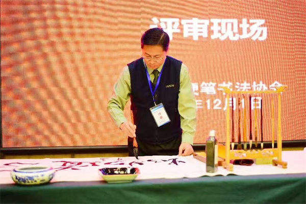 图片说明:担任书法大赛评委的张红太教授现场致辞。