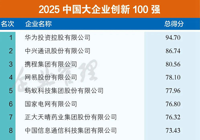 【中国经济报道(中经总网·中经在线)/世界品牌研究院WBRI全媒体矩阵 联合报道】2025年9月15日,中国企业联合会、中国企业家协会发布2025中国大企业创新100强名单。