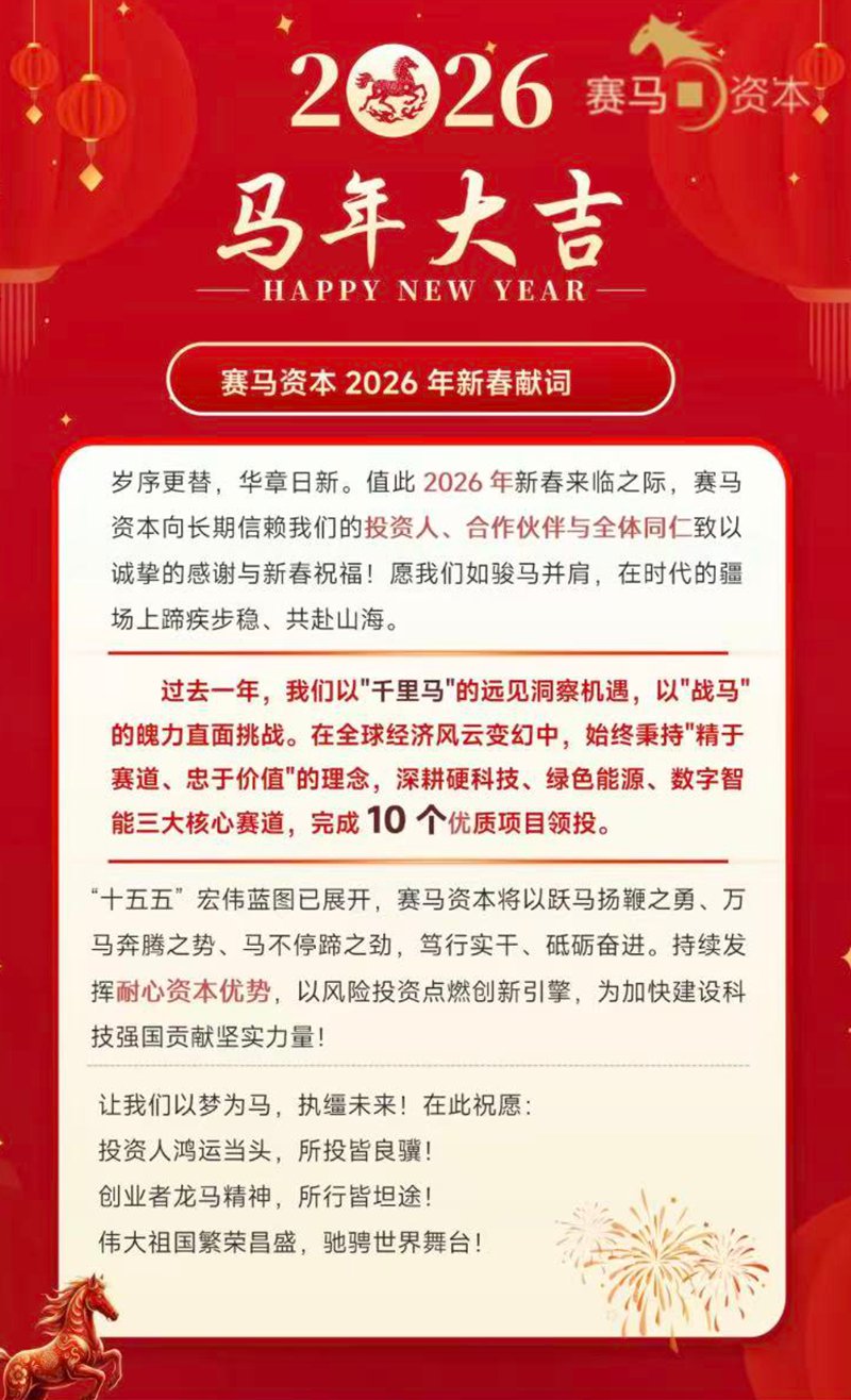 岁序更替,华章日新。值此2026年新春来临之际,赛马资本向长期信赖我们的投资人、合作伙伴与全体同仁致以诚挚的感谢与新春祝福!愿我们如骏马并肩,在时代的疆场上蹄疾步稳、共赴山海。