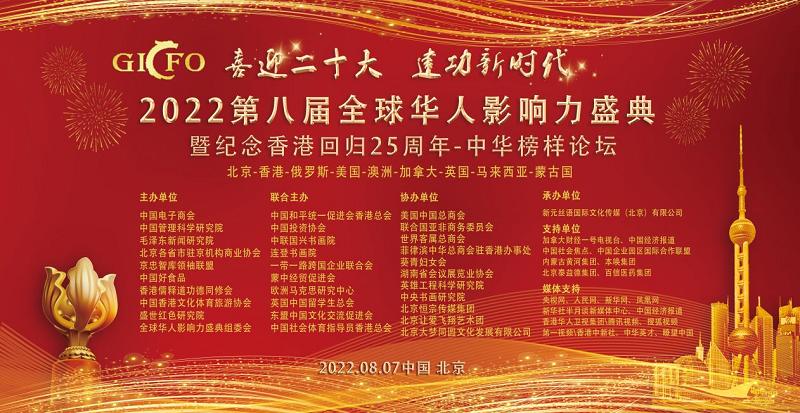 中经网·中经在线讯 经过近半年的筹备和各主办方的努力,以“迎接二十大,建功新时代”为主题的第八届全球华人影响力盛典中华榜样论坛大会,将于2022年8月7日在北京-香港等地如期举办。