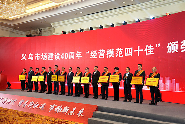 大会一项重头戏是义乌市场建设40周年“经营模范四十佳”颁奖仪式,浙江华统肉制品股份有限公司董事长朱俭军代表华统集团有限公司,兴奋地接过了市委市政府主要领导颁发的:义乌市场建设40周年“经营模范四十佳”的金色奖牌,脸上洋溢着自豪和信心。