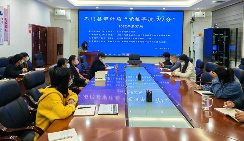 “以铁的纪律保证党的二十大精神在三湘大地落地生根……”每周一早上八点,石门县审计局四楼会议室都会传来阵阵悦耳的读书声。该局将以人民日报、湖南日报等重要党报为载体的“党报早读30分”与学习贯彻党的二十大精神与有机结合,组织全局干部集中学习重要理论文章,通过“党报早读30分”落实党的二十大精神“每周一学”。