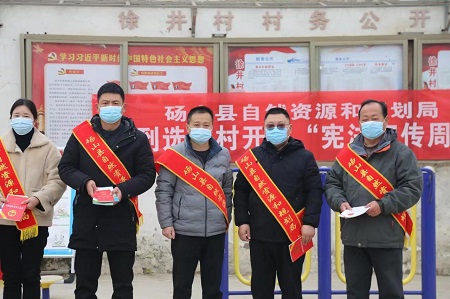 中经网·中经在线讯:为深入学习和贯彻党的二十大精神,引导广大人民群众牢固树立宪法至上意识、增强宪法观念,自觉维护宪法尊严。12月8日,安徽省砀山县自然资源和规划局(县林业局)法治宣讲组冒着寒风来到砀城镇徐井村、高铁新区新城社区两个选派村与驻村工作队一起开展以“宪法宣传周”为主题的法治宣传活动。