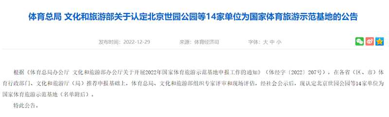 中经网·中经在线讯:据国家体育总局网站消息,12月29日,体育总局、文化和旅游部联合发布《关于认定北京世园公园等14家单位为国家体育旅游示范基地的公告》。