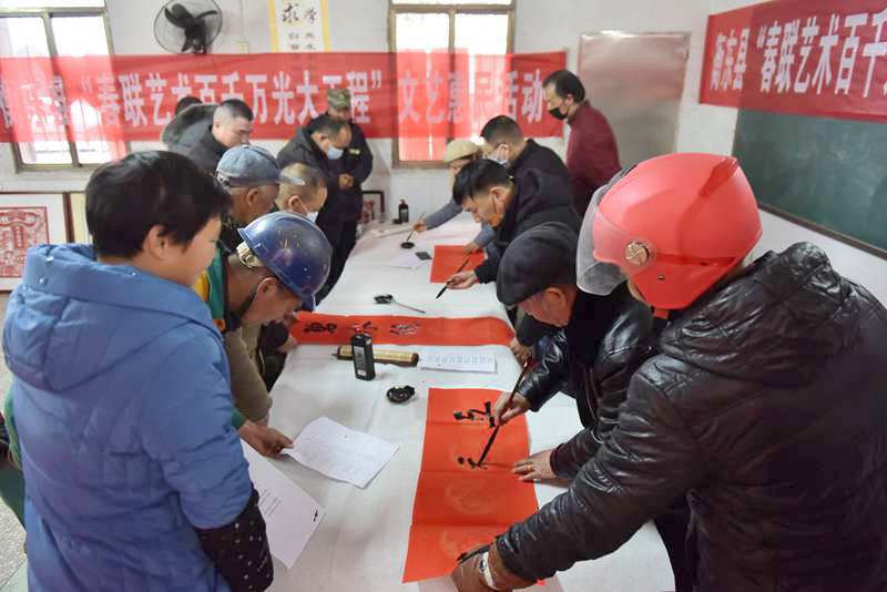 近日,湖南省衡东县文学艺术界联合会组织县书法家协会、县美术家协会、县诗联书画协会在衡东县甘溪镇东冲村开展衡东县“春联艺术百千万光大工程”文艺惠民活动,以“我们的中国梦·文化进万家”送春联活动的形式,现场书写春联,展示剪纸艺术,弘扬优秀传统文化。