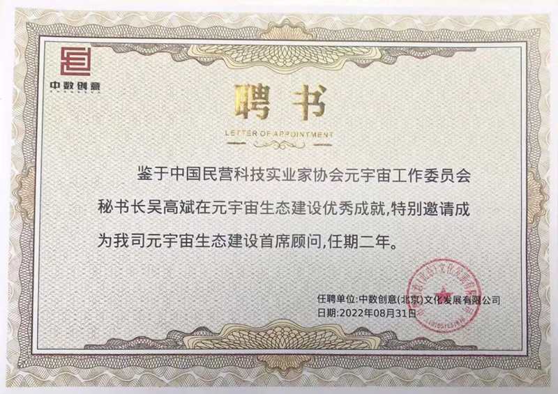 中经网·中经在线讯:近日,中国民营科技实业家协会元宇宙工作委员会(简称中民协元宇宙工委)副会长兼秘书长吴高斌受邀成为中数创意元宇宙生态建设首席顾问。