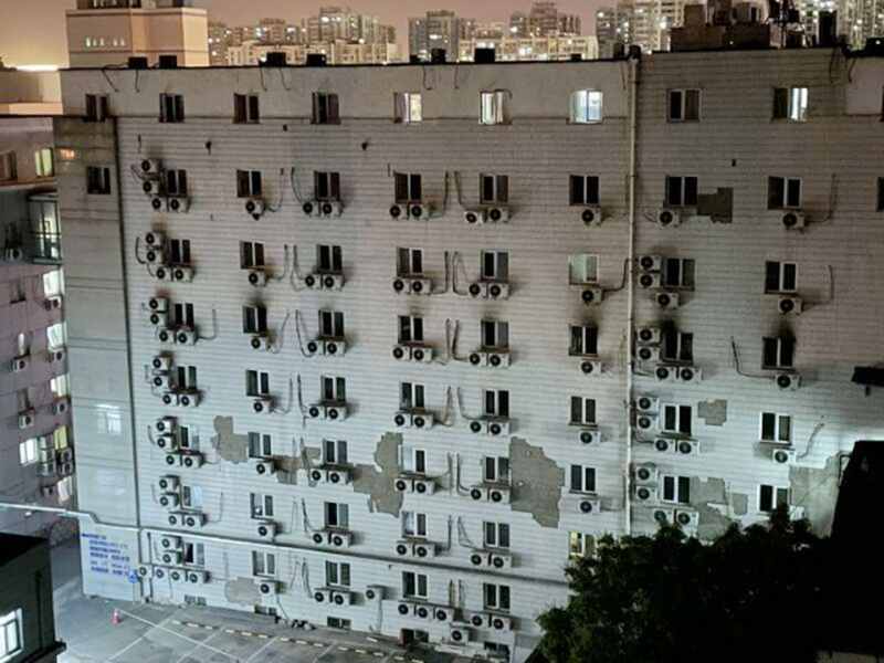 从网友拍摄的火灾现场视频可以看到,起火时,住院部东楼从下到上有多处墙皮脱落,个别区域的脱落面积甚至超过两个窗户的大小。