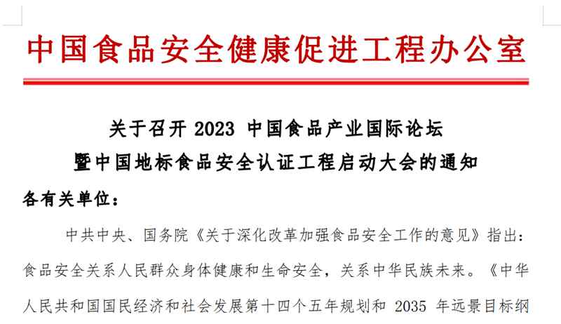 通知|《关于召开2023中国食品产业国际论坛暨中国地标食品安全认证工程启动大会的通知》