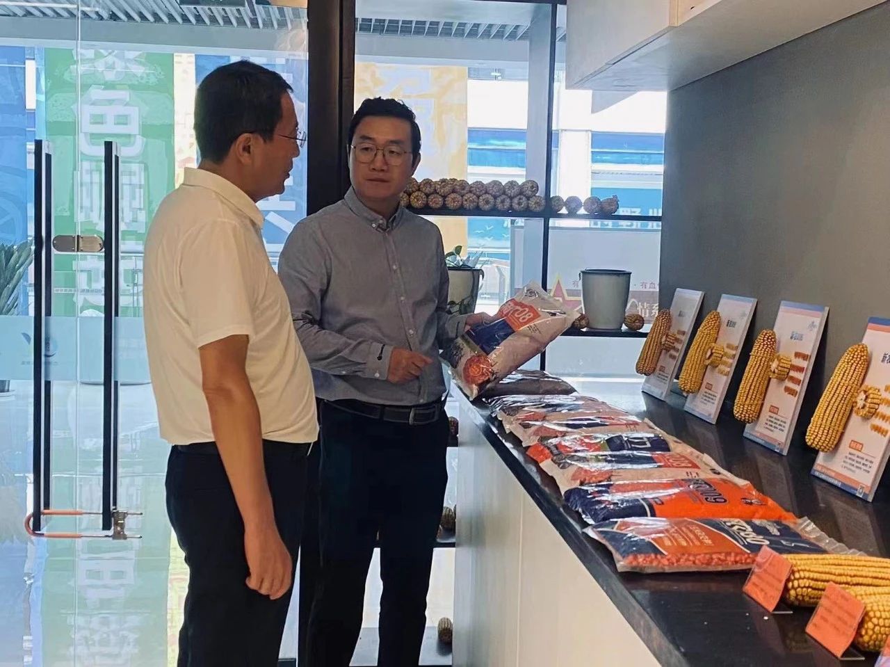董事长兰海波向副主席闫军一行介绍蓝海新农公司情况董事长兰海波向副主席闫军介绍公司文化及科研成果,公司拥有国际先玉米自交系4万多份,研发团队每年创新自交系6千多份。公司在新疆、内蒙古、黑龙江设有3个品种鉴定中心,在全国各个玉米种植区设有100余个试验点。公司在海南及内蒙古设有2个研发基地。