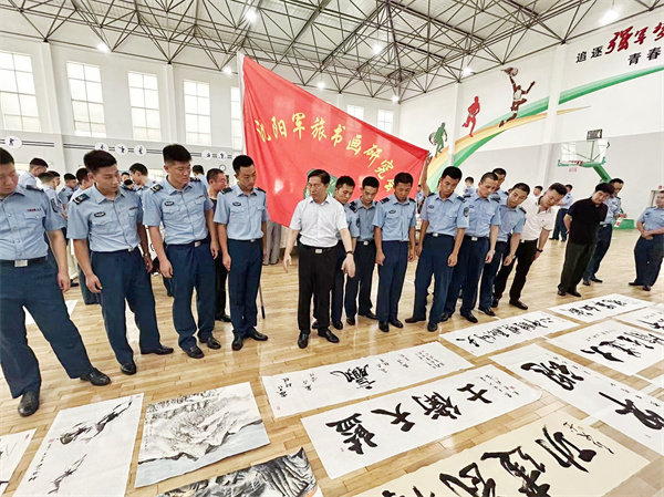为庆祝中国人民解放军建军96周年,推进军民文化融合,深入开展国防教育,体验火热军营生活,7月29日,沈阳军旅书画研究会组织部分书画艺术家赴北部战区空军某部,开展庆“八一”书画创作交流活动,受到部队官兵欢迎。这也是沈阳军旅书画研究会于今年3月5日走进雷锋生前所在部队之后,再次走进军营开展文化拥军和艺术交流活动。