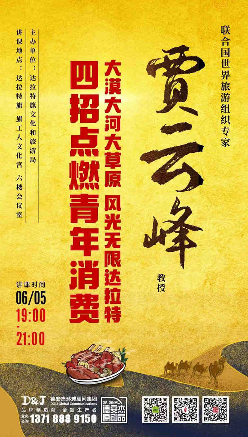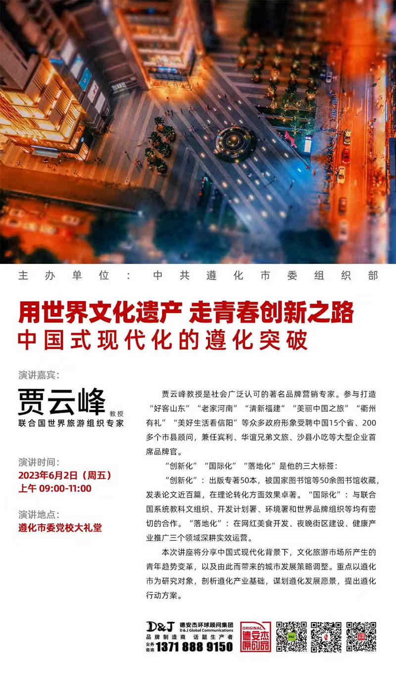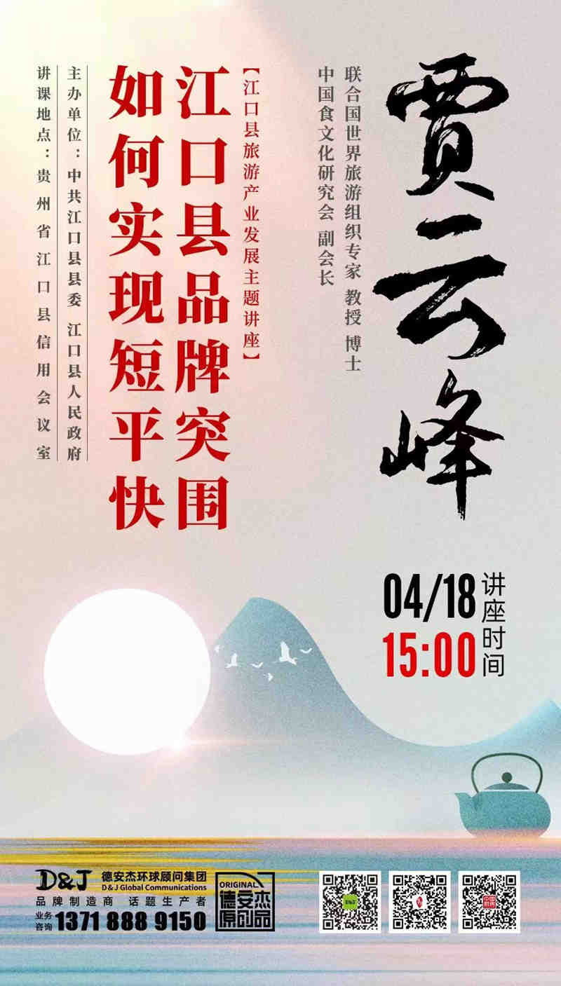 贾云峰教授,社会广泛认可的著名品牌营销专家。参与打造“好客山东”“老家河南”“清新福建”“美丽中国之旅”“衢州有礼”“美好生活看信阳”等众多政府形象,受聘中国 15 个省、200 多个市县顾问,兼任宾利、华谊兄弟文旅、沙县小吃、江西省旅游集团等大型企业首席品牌官。