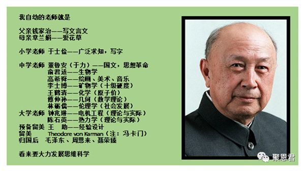 钱老何其幸运!在这份名单里,除了父亲、母亲和回国后直接引导和支持他工作的三位政治家——毛泽东主席、周恩来总理和聂荣臻元帅(其时主管国防科技)以外,是从小学、中学、大学直到留美的14位老师。