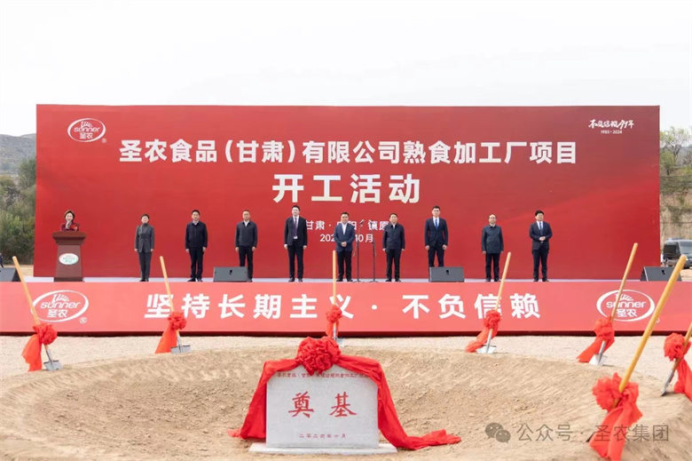 10月9日,圣农集团旗下圣农食品(甘肃)有限公司熟食加工厂项目开工仪式在甘肃庆阳市镇原县举行。庆阳市市委书记黄泽元、市委副书记/市长周继军、镇原县县委书记陈磊、镇原县县委副书记/县长罗睿、圣农集团副总裁廖俊杰、圣农集团副总裁李惠阳等领导共同为项目开工进行培土奠基。