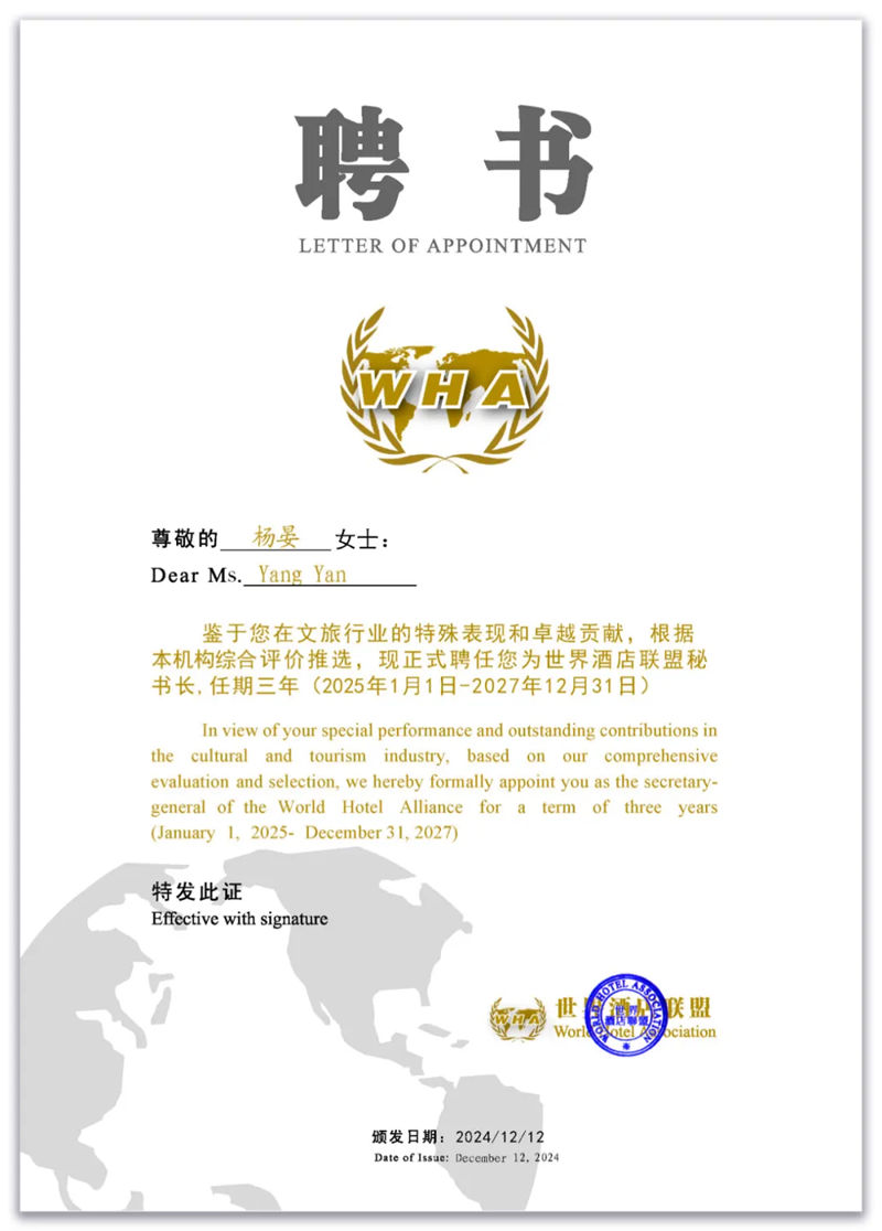 中经总网/世界品牌研究院讯:据世界酒店联盟消息,经研究决定,世界酒店联盟新聘杨晏任秘书长、梁玮任常务秘书长,李新、杨毅任常务副秘书长。任期三年。自2025年1月1日起生效。
