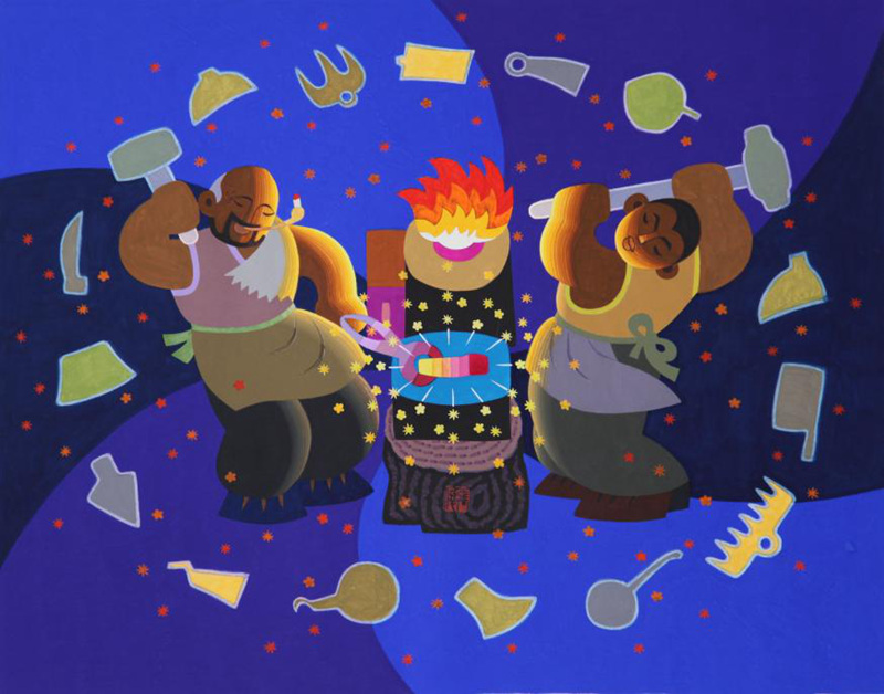 张俊应该是个天生的画家,从思维到技巧别人都无法复制。他对世象的观察、思考与表现都与别人有着不一样的角度和表达方式。在上世纪八十年代初步兴起的民间文化抢救与振兴热潮中,张俊沉浸在民间,贪婪地汲取着民间艺术的滋养,以他的热血灵魂回报着热土,拓展着一条阳光明媚的“新民间绘画”之路,在全国成为一位旗帜性的人物。中国改革开放初期,春花浪漫、生机勃勃的一个时代,一切都在释放着巨大的能量。为人低调、不事张扬的张俊,以他的才情释放,给当时的美术界不断创造着惊喜。1983年,忻州地区群众艺术馆组织农民画创作班,张俊是第一批创作成员,他的作品可以说一路高歌、毫无悬念地杀进全国美展。秋季全国农民画展在中国美术馆举行,是那一年文化部和中国美协共同主办的一个重要大展。当时我作为展览评委参加评奖,在最后确定一等奖时,就是山西张俊的“炉火照天地”,和辽宁张玉艳的“幸福的晚年”两幅作品之间谁进入第一,评委们产生了非常激烈的争论。因为当时招展通知对作品的尺幅有要求,不超过整开尺寸。张玉艳作品长逾七米,因为尺寸大,人数多,自然从视觉震撼上引人注目,再一个大家很佩服作者对那么多人物的塑造和表现技能。但如果按照展览入展要求却不合规范。从艺术表现力方面,评委中对非常写实的“幸福的晚年”,和对张俊夸张变形又极具装饰美感的“炉火照天地”之间,到底谁才该成为大展一等奖,各持见解、僵持不下。最后一位部领导表态照顾鼓励女画家,建议把一等奖定为“幸福的晚年”,张俊屈居第二。但我知道,从艺术水平而言,张俊的“炉火照天地”才是大家心目中当之无愧的一等奖。后来,这幅作品在当时全国美术专业期刊和文学类期刊争相刊载,几十家国家级省级报刊杂志封面几乎被一统天下,张俊便成为当年美术界的新闻人物了。也正是这一惊世起步,奠定了张俊在美术界的地位。