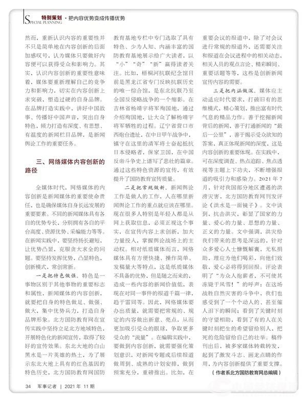 2021年第11期《军事记者》在“特别策划•把内容优势变成传播优势”专栏刊发了此文。文章指出,全媒体时代,网络媒体内容创新显得尤为重要和迫切,网络媒体内容创新应遵循新闻传播规律,坚持继承与发展、守正与创新相结合,在深挖内涵,增强特色,打造品质上下功夫,以保持网络媒体长久旺盛的生命力。