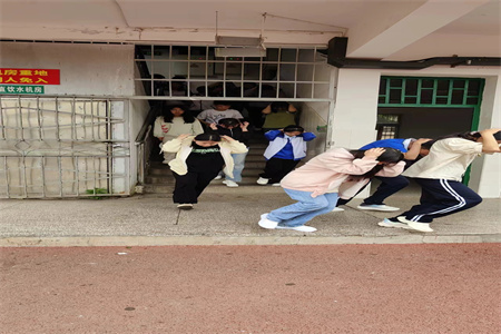 活动开始后,随着急促的防灾警报声响起,老师各司其职,指导学生有秩序地迅速撤离。学生们双手抱头,蜷曲身体,按照事先规划好的路线,迅速、有序撤离教室,跑向前操坪集合。当同学们安全、顺利地抵达安全区后,各班班主任立即清点本班学生人数,确认学生均已安全撤离,并向现场总指挥汇报。