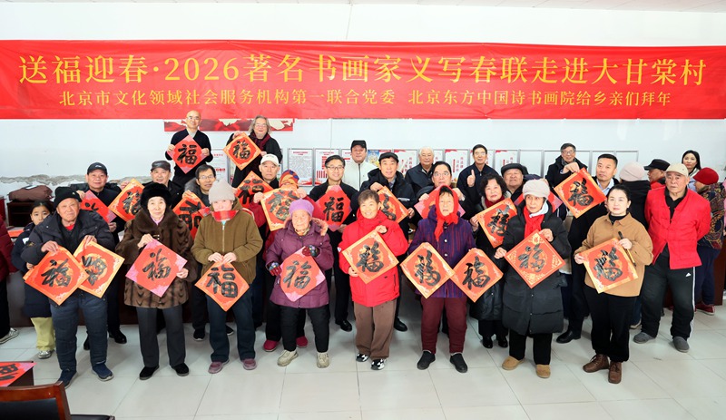 一大早,冒着凛冽的寒风,素有“百姓艺术家”之称的著名诗人、书画家、北京东方中国诗书画院院长刘迅甫,北京市文化领域社会服务机构第一联合党委书记孟有新、党建指导员金连柱,带领北京东方中国诗书画院所组成的著名书画家团队,如约出现在历史悠久的通州区潞城镇大甘棠村,一场“送福迎春·2026著名书画家义写春联走进大甘棠村”活动在这里举行。