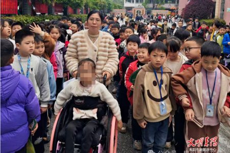 金南小学的校园里,处处可见台阶。李美丽一遍遍摸索路线,记下最平缓、最安全的通道。推轮椅成了她的日常必修课,清晨推进教室,小心翼翼避开桌椅棱角;课间操推到操场,陪孩子坐在轮椅上看同学们奔跑;放学时,仔细摆放好桌椅,再稳稳将轮椅送到家长手中。