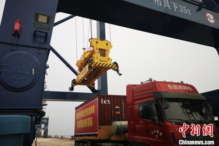 中新网宜昌1月6日电 (朱灿义 关业飞 董晓斌)随着装载玉米的集装箱在湖北交投宜都港3#集装箱专用泊位平台缓缓落下,三峡综合交通运输体系重要项目宜都港的集装箱业务于6日正式开通运营,也标志着宜都港码头开启全面运行。