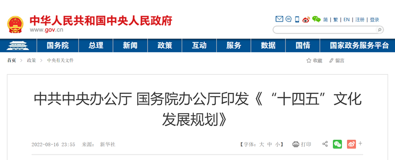 新华社北京8月16日电 近日,中共中央办公厅、国务院办公厅印发了《“十四五”文化发展规划》,并发出通知,要求各地区各部门结合实际认真贯彻落实。