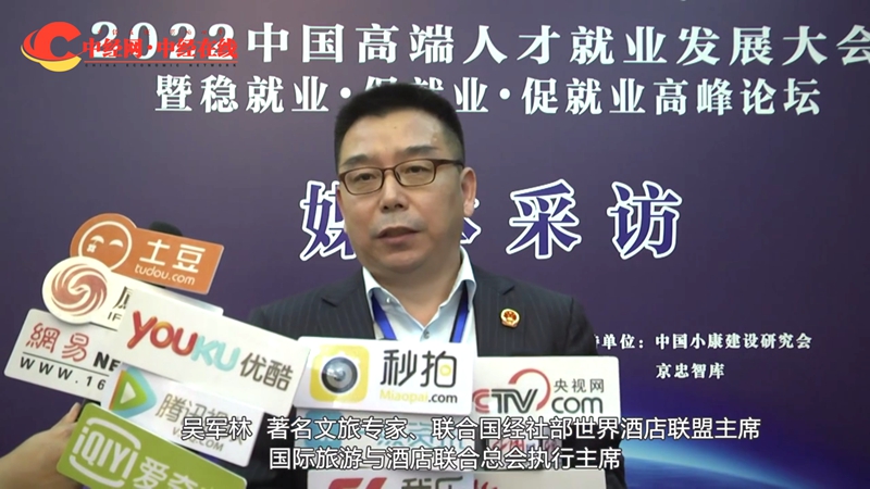 中经网·中经在线讯(熊辉 王海珠)9月12日,由中国商业股份制企业经济联合会、北京各省市驻京机构商务协会联合主办,中国小康建设研究会、京忠智库支持举办的“2022中国高端人才就业发展大会暨稳就业•保就业•促就业高峰论坛”在京召开。著名文旅专家、联合国经社部世界酒店联盟主席、国际旅游与酒店联合总会执行主席、中经网·中经在线联席主席吴军林应邀出席大会并现场接受媒体专访。