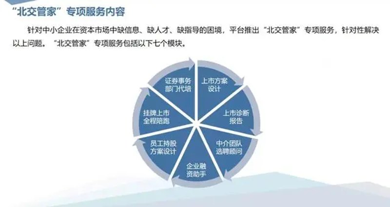 北京企业上市综合服务平台是市政府进一步高效推动和支持企业上市发展的工作支撑平台。针对创新型中小企业在资本市场中缺信息、缺人才、缺指导的“三缺”困境,平台推出“北交管家”专项服务,为中小企业冲击北交所提供全方位的服务。
