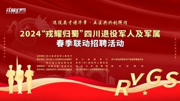 本次招聘活动由四川省退役军人事务厅主办,人力资源社会保障厅、教育厅、省国资省工商联以及各市(州)退役军人事务局联办。活动将采取线上线下联动的方式组委、织,线下招聘会时间为3月26日,主会场设在中国成都人力资源服务产业园(成都市青羊区清江中路20号),同步在泸州、绵阳、广元、广安、雅安、眉山等市(州)设分会场,集中组织线下招聘活动;线上招聘周时间为3月26日至4月1日,在“戎耀归蜀"信息平台、四川公共招聘网、联合招聘网同步进行。