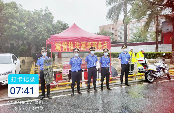 考场内,莘莘学子奋笔疾书,考场外,城管蓝、环卫橙全力保障。面对高考服务保障这道题,河源城管人相互协作、紧密配合、悉心服务,努力发扬城管铁军精神,守护着广大考生的青春梦想,用心答好城市管理这套试卷,全力以赴为广大考生保驾护航。
