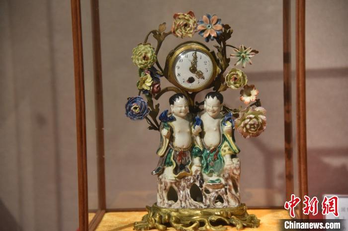 “其中大多数的藏品皆为跨越山海而来。”王仁波指着一台“和合二仙花开富贵瓷钟”介绍道,瓷钟产于1870年前后,出自西洋匠人之手,工艺精美,色彩明艳,“和合二仙”笑容可掬,栩栩如生。