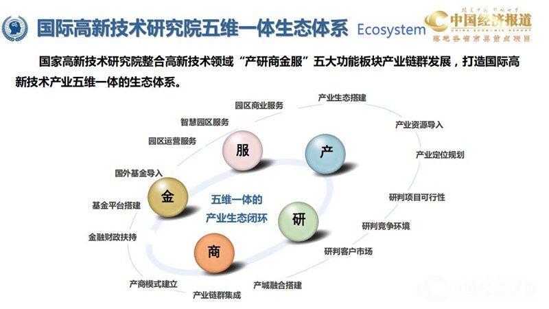 国家高新技术研究院整合高新技术领域“产研商金服”五大功能板块产业链群发展,打造国际高 新技术产业五维一体的生态体系。