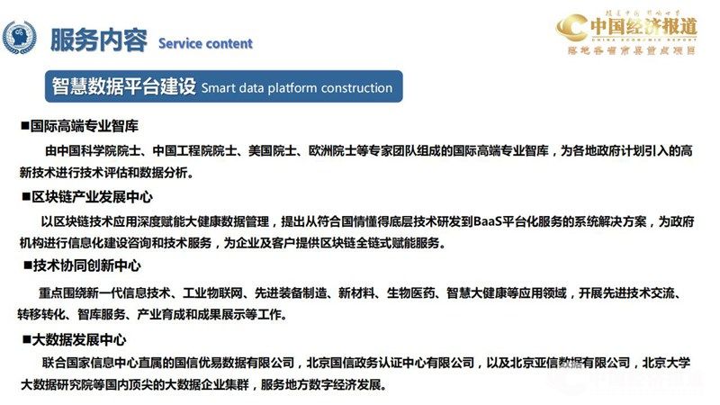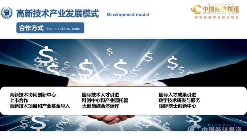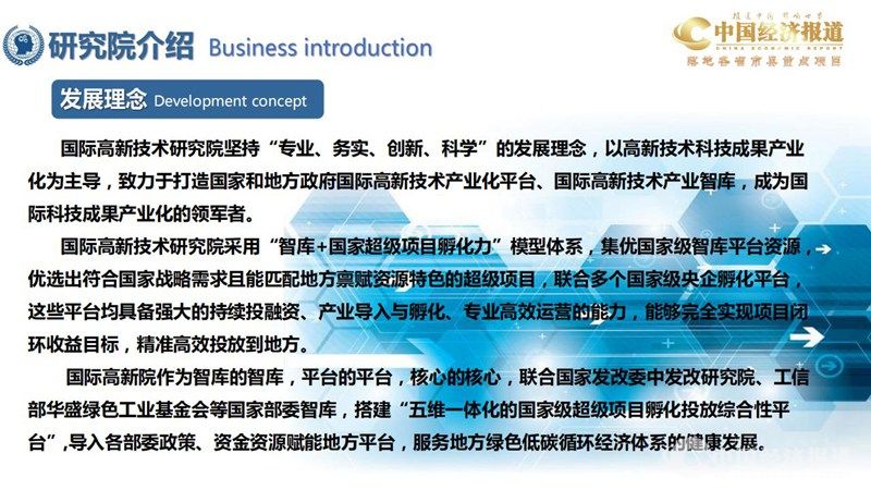 国际高端专业智库:由中国科学院院士、中国工程院院士、美国院士、欧洲院士等专家团队组成的国际高端专业智库,为各地政府计划引入的高 新技术进行技术评估和数据分析。