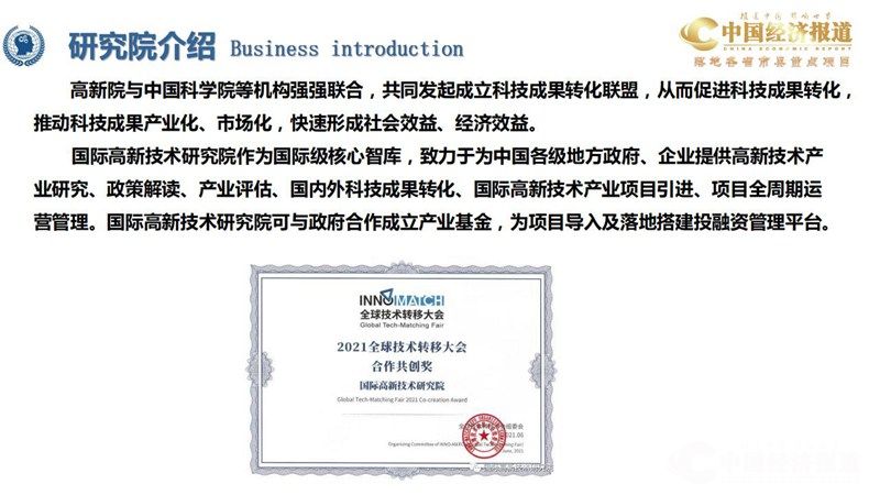 国际高新技术研究院作为国际级核心智库,致力于为中国各级地方政府、企业提供高新技术产 业研究、政策解读、产业评估、国内外科技成果转化、国际高新技术产业项目引进、项目全周期运 营管理。国际高新技术研究院可与政府合作成立产业基金,为项目导入及落地搭建投融资管理平台。