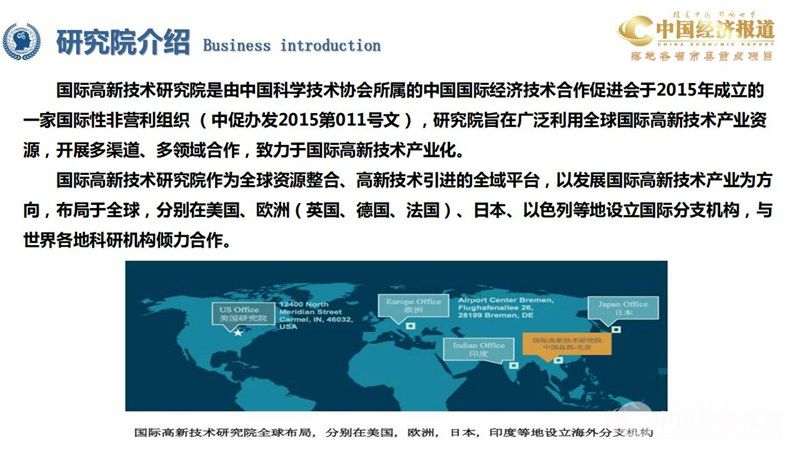 国际高新技术研究院是由中国科学技术协会所属的中国国际经济技术合作促进会于2015年成立的 一家国际性非营利组织 (中促办发2015第011号文),研究院旨在广泛利用全球国际高新技术产业资 源,开展多渠道、多领域合作,致力于国际高新技术产业化。
